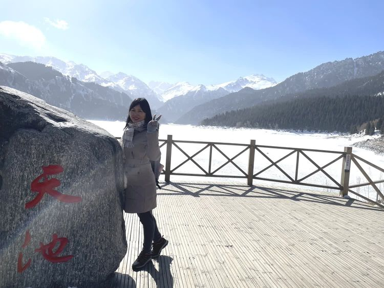 到達(dá),留影。4月上旬的天池,冰雪尚未消融,瑤池還是一個冰池。